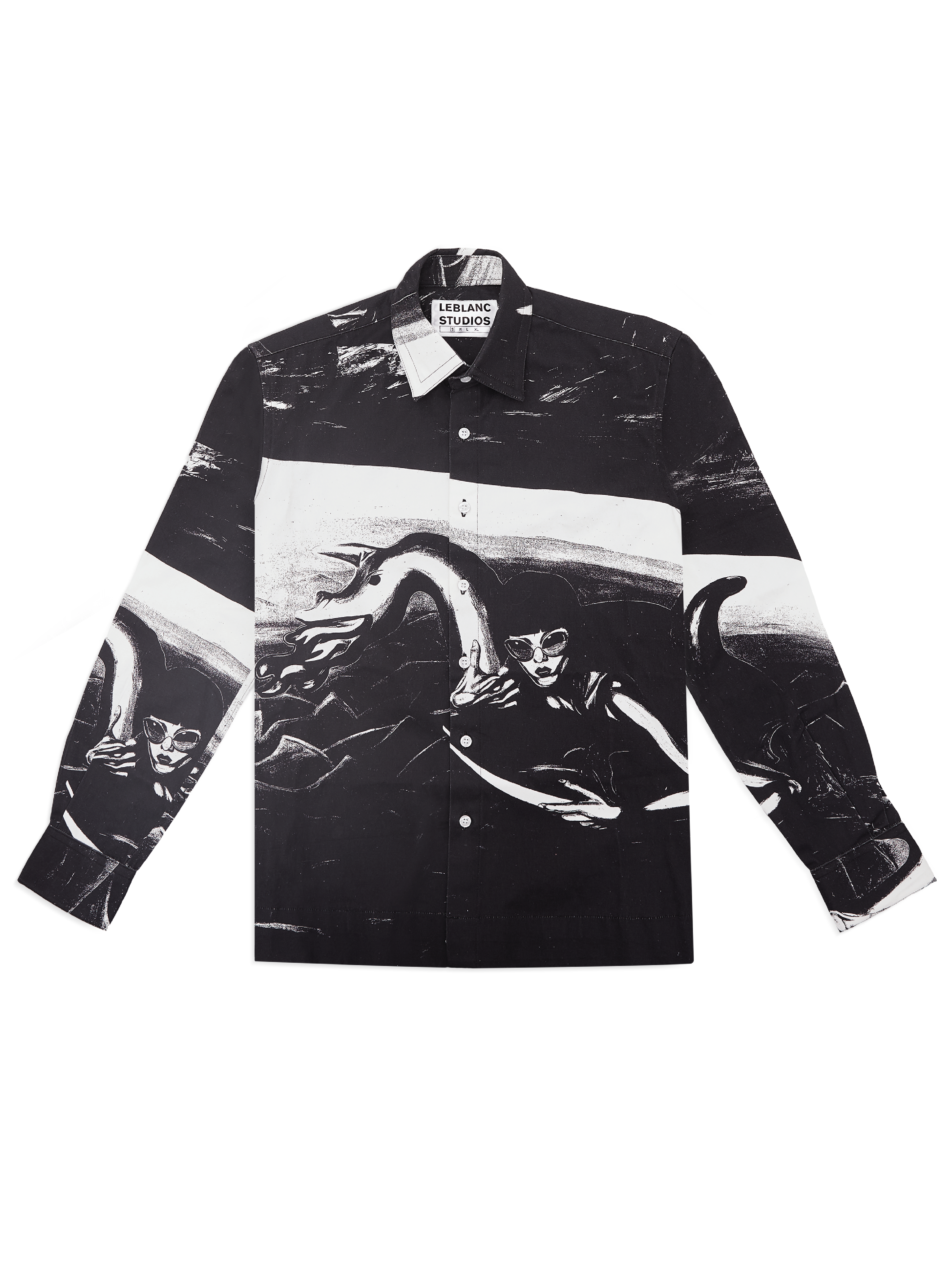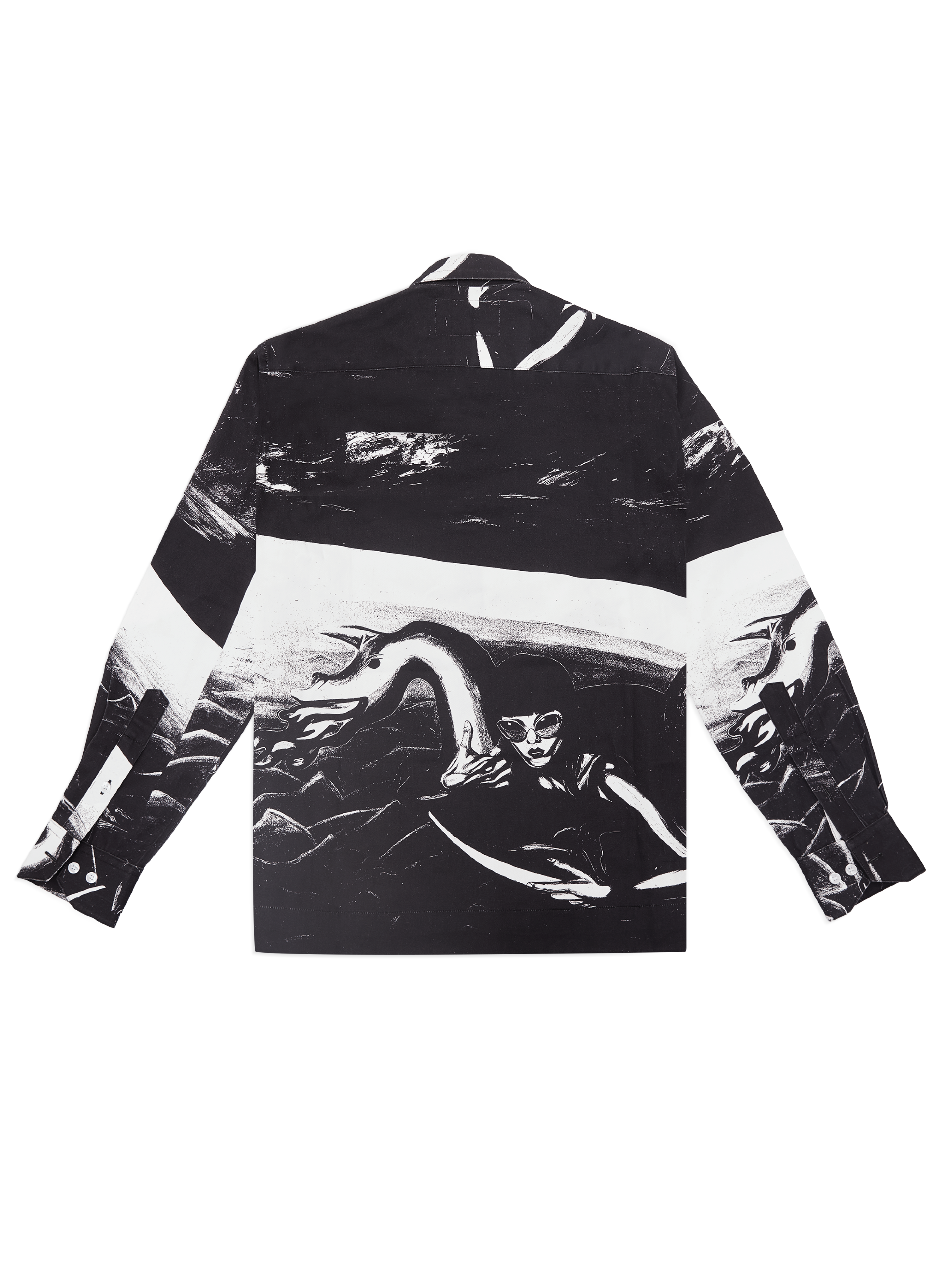 Designed from his last collections of paintings. This shirt features a painting that has been transformed into a black and white comic-inspired graphic. Printed in heavy cotton twill.